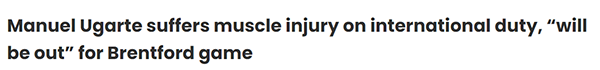 在乌拉圭与厄瓜多尔的世预赛中,他在81分钟受伤离场,乌拉圭国内的《国家报》报道披露,乌加特坐倒在地后立即请求换人。经过乌拉圭队医的检查,现在确认他肌肉拉伤,肯定会缺席本周末对布伦特福德的比赛。讽刺的是,乌加特加盟曼联前,一度以基本不受伤著称!