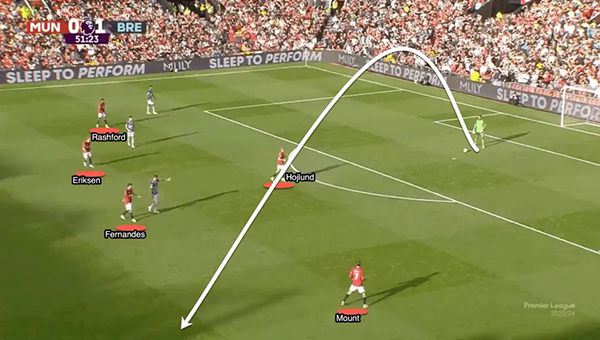 然而,只要稍作调整,曼联可以改变这种不利的局面,只要让奥纳纳延长控球时间,放弃后场传递,让更多球员压到中场,然后接应门将的长传。
