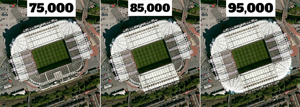 开发商已经向曼联保证,只要资金足够,他们能把老特拉福德扩大到俱乐部想要的任何容量。俱乐部的计划是将博比·查尔顿看台拆除,换成双层观众席,并且将著名的西看台和对面的东看台安装第三层。