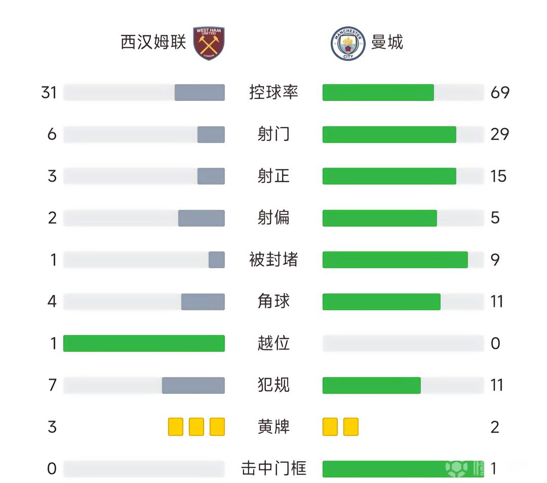 最终,曼城客场3-1逆转西汉姆收获五连胜。