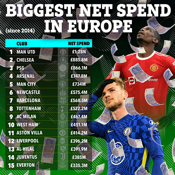 同期净支出排名第二的是切尔西,他们的消耗了8.83亿英镑,比曼联少了3亿多,而且还拿到了两次英超冠军和一座欧冠。过去10年他们花的钱最多,高达22.5亿英镑,但出售球员收回了13.7亿英镑。伯利喜欢砸钱买人,但也擅长卖人。