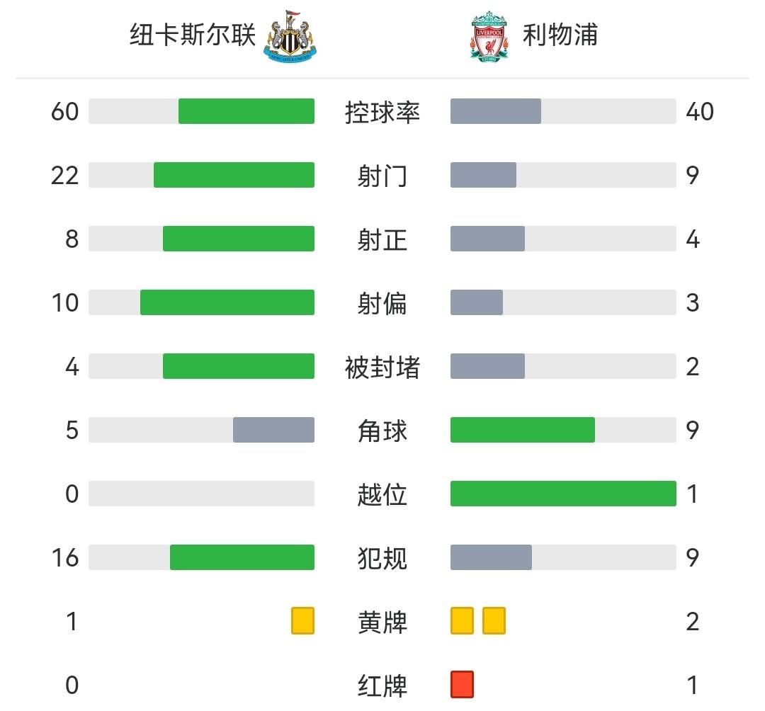 第24分钟,阿诺德后场停球失误送礼,戈登抢断单刀球冷静推射得手,纽卡斯尔1-0利物浦。