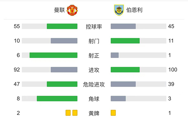 全场比赛结束,最终曼联2-0战胜伯恩利。