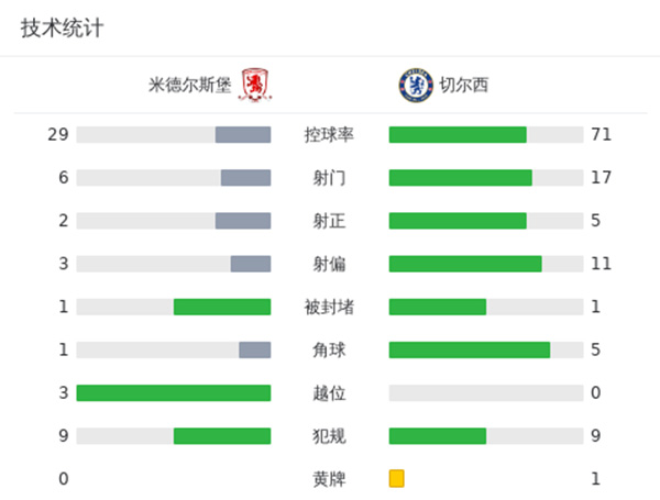 第36分钟,巴利瑟后场长传,琼斯右路穿裆科尔维尔横敲,赫根尼包抄推射得手,米德尔斯堡1-0切尔西!