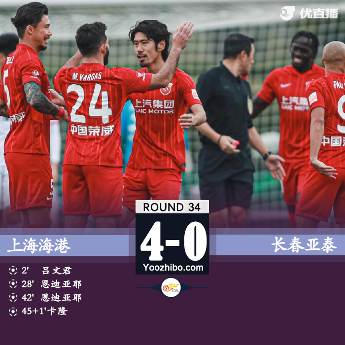 24直播网12月31日讯 北京时间12月31日15:00,中超联赛第34轮上海海港迎战长春亚泰的比赛,上半场吕文君闪击,恩迪亚耶双响,卡隆中超首球,下半场双方均无建树,最终海港4-0大胜亚泰。