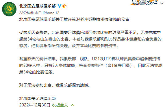 当然国安也是没有办法的,上一轮对阵上海海港的比赛他们就已经弃权,疫情冲击很厉害。末轮之前向足协申请继续退赛,继续当时的国安队内只有5人符合参赛的要求。在官宣退赛之后,国安表示俱乐部可参加比赛的球员严重不足,一线队、U21及U19梯队球员具备中超参赛资格的50多人中,只有5人身体健康,所以确实无法赶上好山东泰山的比赛。