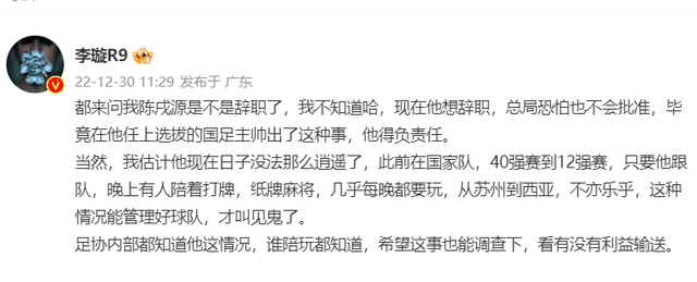 李璇表示:“在国家队,40强赛到12强赛,只要他跟队,晚上有人陪着打牌,纸牌麻将,几乎每晚都要玩,从苏州到西亚,不亦乐乎。”李璇还表示,陈戌源喜欢打牌,这在足协内部人尽皆知。李璇也讽刺道,这样管理球队,球队能好才怪。他也希望足协能够调查一下这件事,查一查有没有利益输送。