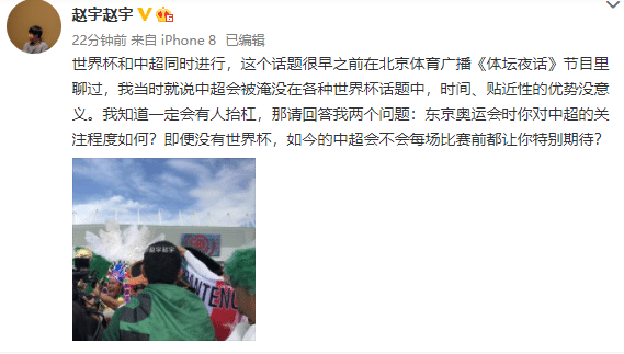 很显然,卡塔尔世界杯如火如荼的进行着,我们家门口的中超联赛争冠+保级也将有很多的看点,不过因为世界杯的影响力,很多人都认为中超会被淹没在话题中,知名足球记者赵宇就表示:世界杯和中超同时进行,这个话题很早之前在节目里聊过,我当时就说中超会被淹没在各种世界杯话题中,时间、贴近性的优势没意义。我知道一定会有人抬杠,那请回答我两个问题:东京奥运会时你对中超的关注程度如何?即便没有世界杯,如今的中超会不会每场比赛前都让你特别期待?