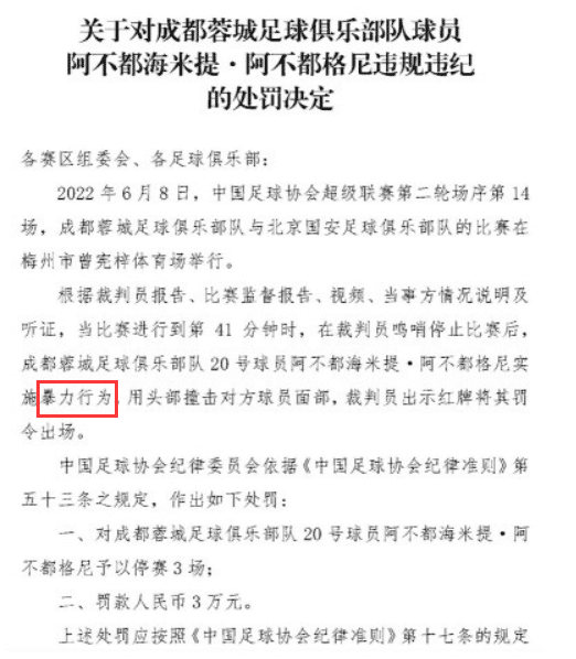阿不都海米提,停赛3场,罚款3万,理由是:暴力行为;