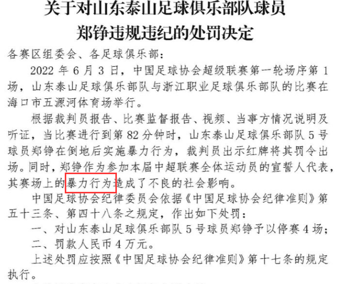 郑铮,停赛4场,罚款4万,理由是:暴力行为;