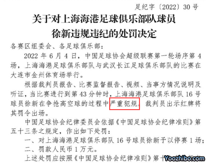 还有海港球员徐新,他的停赛2场,罚款2万其实是分开的,严重犯规,禁赛1场罚款1万;用脚踢碎了球员通道的玻璃门,禁赛1场罚款1万;外界的争议的点在于徐新的行为被定义为“严重犯规”,要知道徐新的犯规其实更加恶劣,这点从在比赛中飞踹胡靖航被直红罚下,胡靖航的球衣都被踹破,身上的伤痕非常明显。再加上他用脚踢碎了球员通道的玻璃门,场内外的行为加在一起,其实影响更加大。