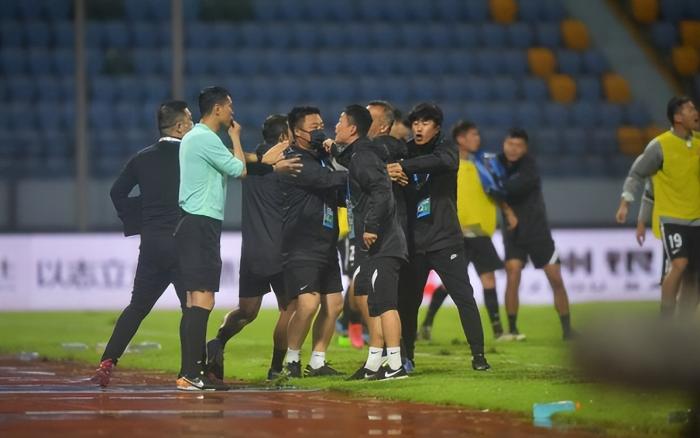 成都蓉城球员和教练非常不满,认为比赛时间没到。主裁判也一脸懵圈,似乎意识到了自己的错误。随后,第四官员进场和主裁交涉。在经过确认之后,主裁判招手示意双方球员都回到场地继续比赛。但中断比赛之后,双方显然受到影响,最终还是3-2结束,北京国安获胜。