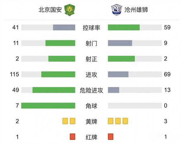 全场比赛结束,国安1-2不敌沧州雄狮。