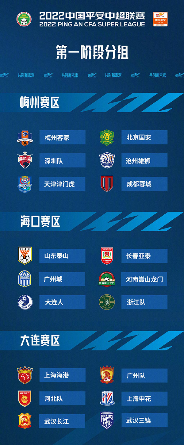 第一阶段球队分组 | 随着2022中国平安中超联赛三大赛区落定,18支中超俱乐部已吹响集结号。第一阶段将于6月3日正式拉开战幕,各队分组情况如下: