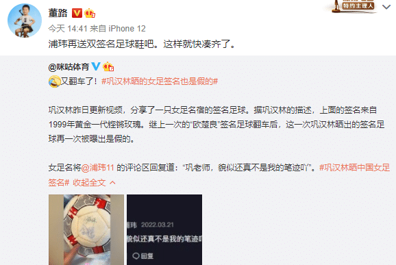 董路看到巩汉林的女足版签名足球是假的之后,在社交媒体上嘲讽:“浦玮再送双签名足球鞋吧。这样就快凑齐了。”