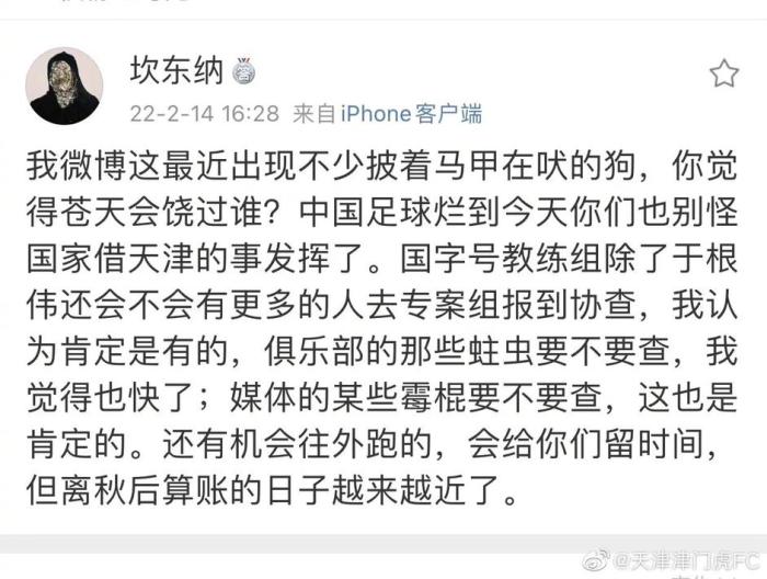 本周四,天津津门虎队将结束假期,在上海集结,正式开启新赛季的备战。今天是本周的第一个工作日,津门虎俱乐部上下原本都忙碌于第一阶段集训的各种细节准备,可是很遗憾,下午看到名为“坎东纳”的微博发布了下图内容,随即在各平台又有自媒体演绎、跟进。鉴于近期关于中国足球的各种传闻甚嚣尘上,我们俱乐部不希望在其中平添飞沙走石,无奈作出相关说明。