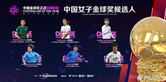 中国女子金球奖候选名单:沈梦雨(上海农商银行/凯尔特人)、唐佳丽(上海农商银行/托特纳姆热刺)、王霜(武汉车谷江大)、吴澄舒(江苏女足)、姚伟(武汉车谷江大)、赵瑜洁(佛罗里达州立大学)