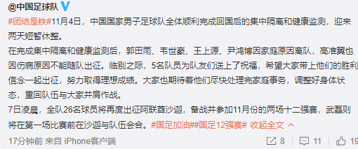 24直播网11月05日讯 今天国足官方宣布了5名球员离队的消息,这是国足近期首度宣布有球员离开本届12强赛,他们分别是郭田雨、韦世豪、王上源、尹鸿博因家庭原因离队,高准翼也因伤病原因不能随队出征。此前的报道显示国足在阵容上除了会做减法之外,还会做加法,也就是进行人员上的补充。具体的出征名单,将会在最后时刻才能够确定。