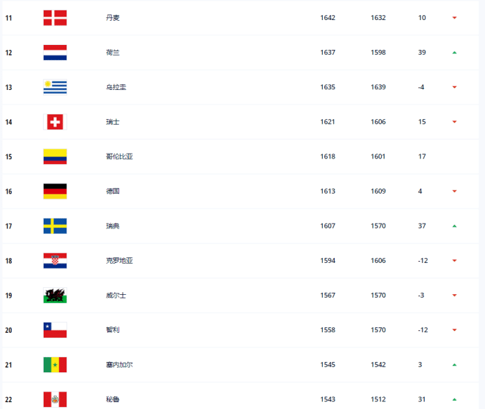 如图,排名榜首的依然是比利时国家队,而巴西国家队进入美洲杯决赛,所以他们上升到了第二。而法国国家队在欧洲杯早早出局,他们的排名下滑到了第三。第四到第十的球队分别是英格兰、意大利、阿根廷、西班牙、葡萄牙、墨西哥和美国国家队。而第十一到第二十分别是丹麦、荷兰、乌拉圭、瑞士、哥伦比亚、德国、瑞典,克罗地亚、威尔士和智利。