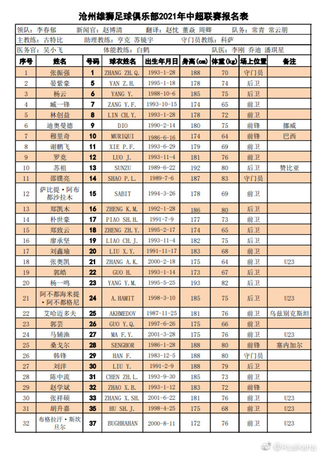 | 37 | 布哈拉汗-斯卡达 | - | - | 中场 | 中国 | - | - |