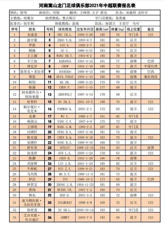2021-22赛季中超河南嵩山龙门球员名单一览