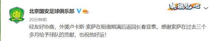 经友好协商,外援卢卡斯·索萨在租借期满后返回长春亚泰。感谢索萨在过去三个多月给予球队的贡献,也祝他好运!