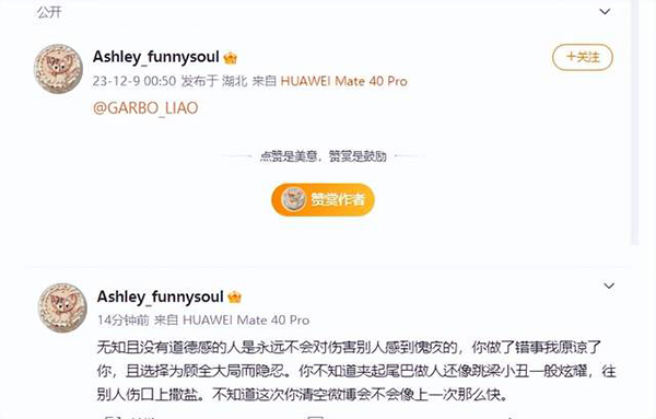 这位社交媒体名为Ashley的蒿俊闵前妻,在社交媒体上写道:“聚散皆有缘,离合总关情。我与蒿先生已于今年8月24日离婚。”这条看似比较中性的动态,其实是在为之后炮轰蒿俊闵做铺垫。随后,凌晨1点她又发布一条动态写道:“无知且没有道德感的人是永远不会对伤害别人感到愧疚的,你做了错事我原谅了你,且选择为顾全大局而隐忍。你不知道夹起尾巴做人还像跳梁小丑一般炫耀,往别人伤口上撒盐。”
