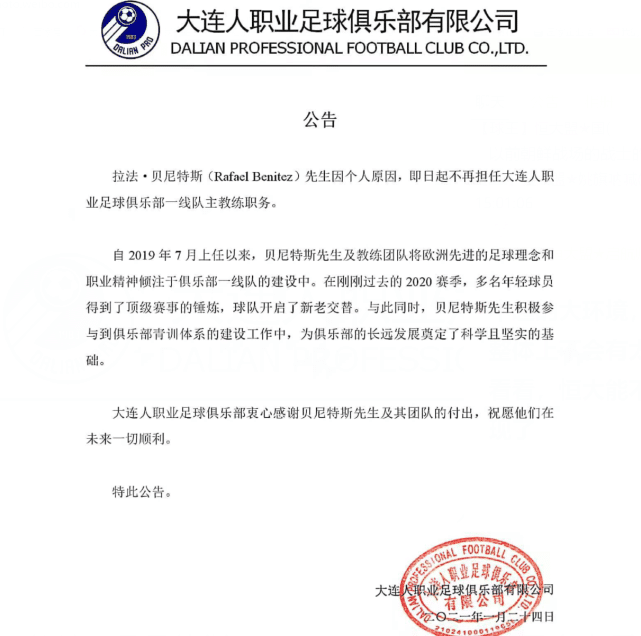 贝尼特斯发表离别宣言,大连人也给他送别。贝尼特斯在社交账号上发文:“从今天起,我和我的教练团队将不再执教大连人足球俱乐部。感谢球员、医疗团队和俱乐部的支持。”随后,大连人队也作出官方回应:“衷心感谢贝尼特斯先生及其团队的付出,祝愿他们在未来一切顺利”。正当“大环境”不太好的时候,“中超新规”赐给你多次层的“糟糕”。大牌外援离开中超,除了个人薪水的考虑之外,还是他们以及俱乐部对于持续的“限额”的失望。近几个赛季的中超金靴,扎哈维没有与富力续约离开;上海上港的头号球星,“绿巨人”胡尔克宁愿失业也要离开;保利尼奥也通过各种渠道表达离开恒大的想法,即使他还有一年半的合同。