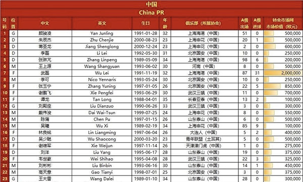 前锋:16-林良铭(大连人)、20-韦世豪(武汉三镇)、7-武磊(上海海港)、10-谢鹏飞(武汉三镇)、11-谭龙(长春亚泰)、9-张玉宁(北京国安)、18-谢维军(天津津门虎)