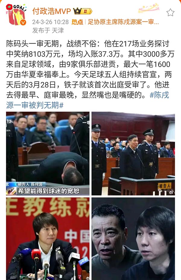 来源:24直播网03-27 17:1624直播网讯 昨日3月26日,中国足坛风暴中卷入的陈码头等人的一审判决结果也是一个个出炉,比如说陈码头,因为受贿8103万,陈码头哪怕全部退赃了,还是被判了一个无期,这也是中国体坛至今最高的处罚。