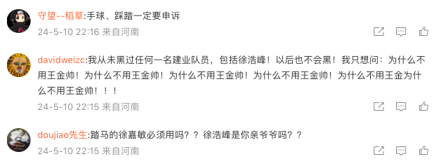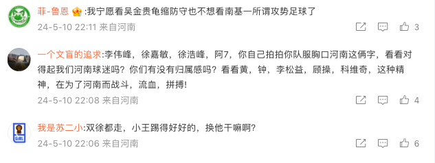 此外,河南队门将徐嘉敏也是球迷集中指责的对象:“我们有上守门员吗?10轮比赛了徐佳敏在的比赛基本上对方只要射正就能进球,反应为0,意识为0,扑球动作不舒展不充分,我不明白这种球员为什么要一直在场上蚕食其他球员的努力,10轮比赛23个丢球一点问题都说明不了吗?”;“本来王金帅打的挺好的,你换他干嘛?”:“河南队曾经引以为豪的防守,现在就是个筛子!”
