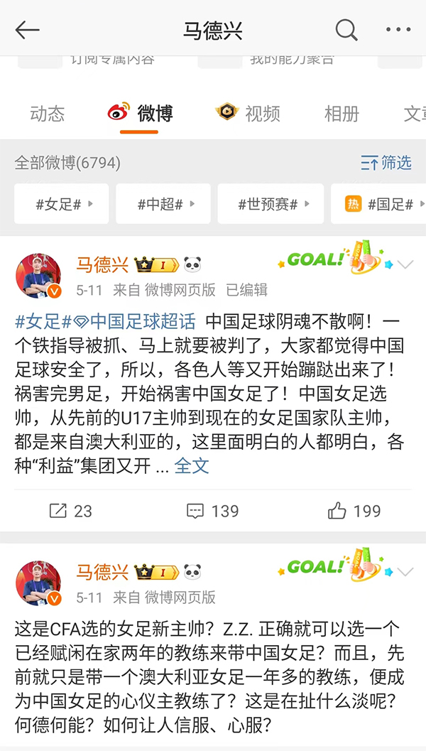 随后,马德兴又表示:中国足球阴魂不散,一个铁指导被抓,马上就要判了,大家都觉得中国足球安全了,所以,各色人等又开始蹦跶出来了,祸害完男足,开始祸害女足!从U17到女足国家队主帅,都是澳大利亚他,这里面明白的人都是明白,各种利益集团又开始了哈。