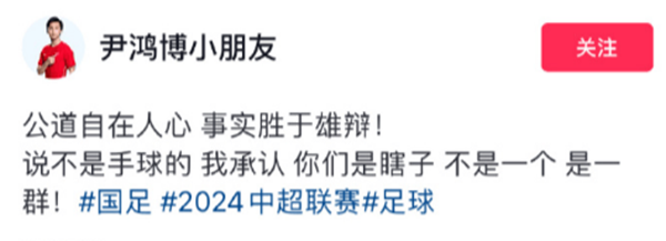 在有海港球迷质疑尹鸿博并且在评论区留言后,这位34岁前国脚选择与网友激烈对线。情绪激动的他,随后更是在社媒写道:“公道自在人心,事实胜于雄辩!说不是手球的,我承认,你们是瞎子,不是一个,是一群!”