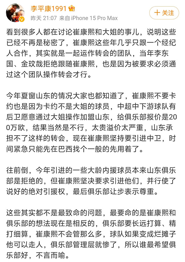 李平康也是曝光,此前崔康熙引入的一些大龄内援球员山东鲁能是拒绝的,但是崔康熙坚持要引进,并且行使了俱乐部此前说道的绝对引援权,最终俱乐部只能让步。李平康强调,现在山东鲁能的问题是崔康熙和俱乐部的想法是相反的,俱乐部要长远打算、精打细算,崔康熙不会管那么多,球队如果变成烂摊子他可以走人,俱乐部管理层就惨了,所以谁最希望俱乐部好,不言而喻。
