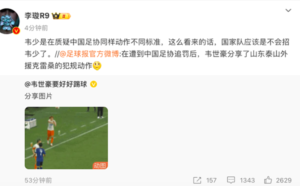 更令人忧心的是,韦世豪还在足协开出罚单后,毫不避讳第一时间在社媒发图公开质疑足协处罚存在“双标”的争议行为。如此公开叫板足协的举动,显然对于韦世豪是没有任何好处的。名记李璇就直言:“这么看来的话,国家队应该是不会招韦少了。”