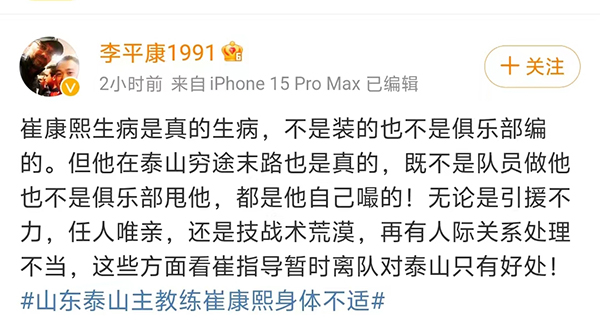 是的,崔康熙返回了韩国,虽然说两周后可能回来,但是也可能回不来了,特别是球队有54岁的韩国名帅金铉敏把持的时候。崔康熙这边到底是什么情况呢?他是真的病了,还是球队为了他的下课再做准备呢?名记李平康也是曝光了内幕,在社交媒体上,李平康表示:崔康熙生病是真的生病,不是装的也不是俱乐部编的。但他在泰山穷途末路也是真的,既不是队员做他也不是俱乐部甩他,都是他自己嘬的!