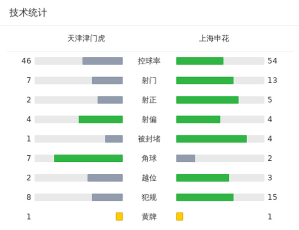 天津津门虎1-1上海申花 罗萨小角度爆射于汉超头球扳平