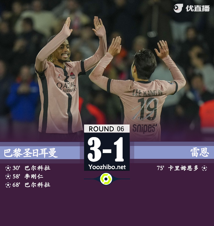 24直播网讯 北京时间9月28日法甲第6轮巴黎圣日耳曼vs雷恩。上半场,马尔基尼奥斯开场破门越位微笑;巴尔科拉兜射破门。下半场,阿什拉夫进球同样越位无效;巴尔科拉兜射中柱,李刚仁补射空门得手;随后巴尔科拉再下一城!本场独造3球!贝拉尔多送点,卡里姆恩多点射破门。最终,巴黎3-1击败雷恩,6轮法甲狂轰20球!继续领跑积分榜。