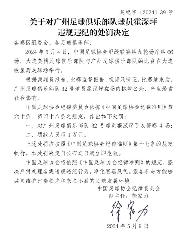 而广州队这边,门将霍深坪也被禁赛4场罚款4万元人民币。让霍深坪本人、广州队俱乐部、以及广州球迷非常不满的是,霍深坪是本次冲突被打的“受害者”,为何也被禁赛呢?