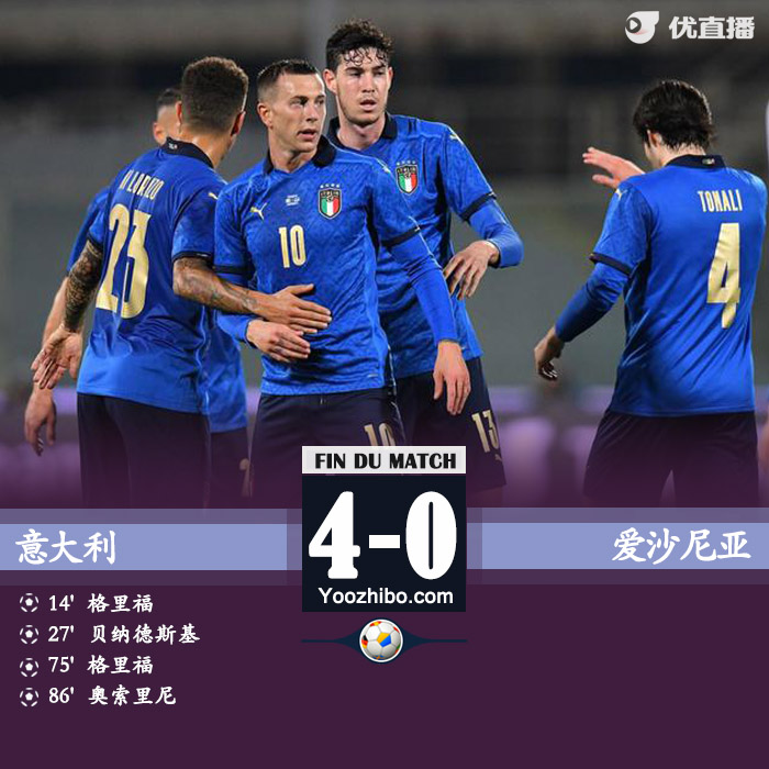 24直播网讯:北京时间11月12日3时45分(意大利当地时间11日20时45分),意大利在佛罗伦萨进行热身,最终4比0完胜爱沙尼亚。首秀前锋格里福梅开二度,贝尔纳代斯基和奥索利尼各下一城。巴斯托尼、卡拉布里亚、佩莱格里、佩西纳、卢卡-佩莱格里尼完成首秀。