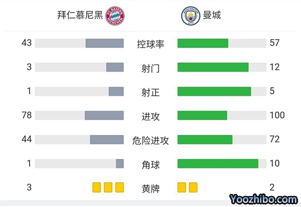 全场比赛结束,拜仁慕尼黑0-1曼城。