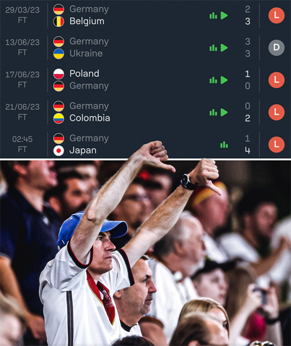 而在遭日本2连杀后,德国男足近期各项赛事已经5场不胜,除了3-3战平乌克兰之外,先后2-3输给比利时、0-1输给波兰、1-4输给日本。更令人担忧的是,下场友谊赛德国男足还将迎战姆巴佩领衔的世界排名第2的法国队,恐怕一场失利在所难免。曾经的世界杯4冠王得主,已经彻底陨落了。