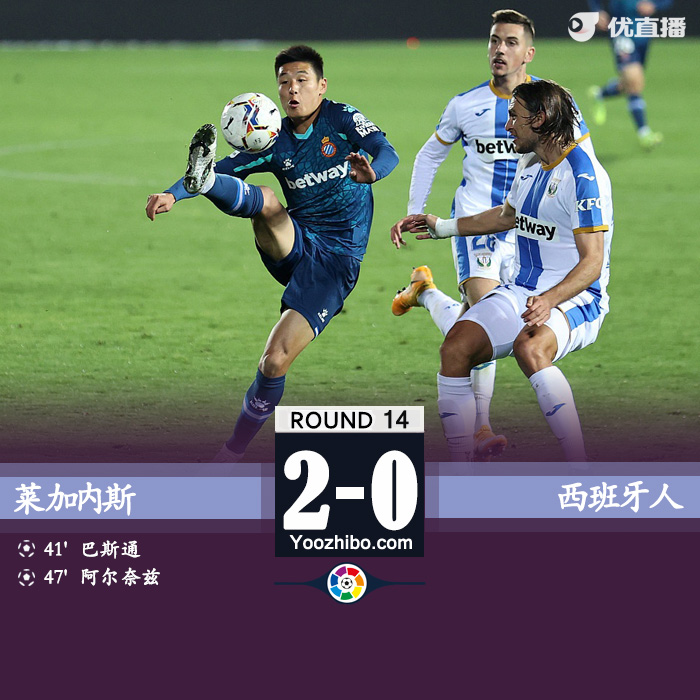 24直播网讯:北京时间11月27日2时(西班牙当地时间26日19时),西乙第14轮开始2场较量,西班牙人客场0比2负于莱加内斯,连续3轮不胜,被对方反超跌至第3位。武磊连续5轮担任替补,第66分钟替补出场。恩巴尔巴任意球中楣。巴斯通首开纪录,米格隆两黄下场,阿奈斯再下一城。