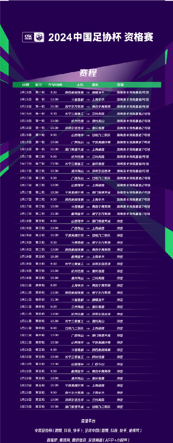 来源:24直播网01-15 13:4724直播网01月15日讯 ,中国足协杯官方消息,1月15日,2024中国足协杯资格赛将在珠海索卡训练基地开赛,18支业余球队抽签分成三组,将展开五轮角逐,向足协杯正赛发起冲击。