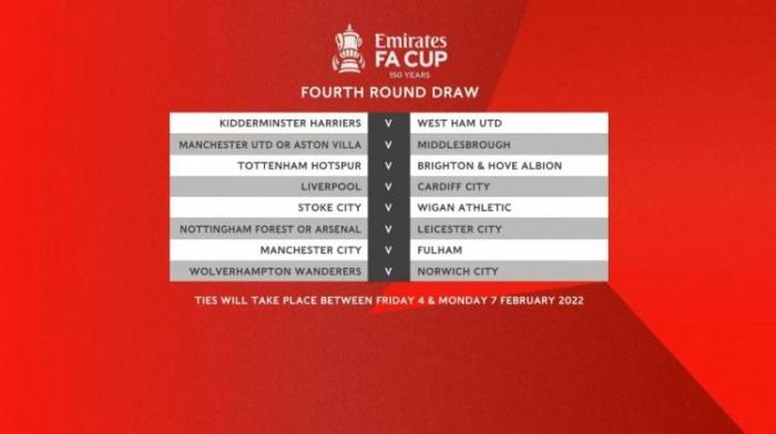 24直播网01月10日讯 今天凌晨,足总杯第4轮抽签结果出炉,热刺遭遇布莱顿,利物浦和曼城踢英冠球队,切尔西踢英甲球队,曼联若晋级将踢米德尔斯堡。