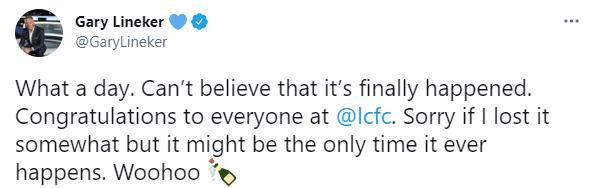 24直播网讯 北京时间5月16日,足总杯决赛,莱斯特城1-0小胜切尔西,夺得队史第一座足总杯冠军。赛后,莱斯特城名宿莱因克尔更新推特。