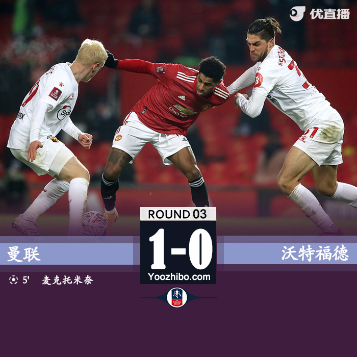 第5分钟,曼联取得领先,特莱斯开出角球,麦克托米奈头球冲顶砸在立柱上反弹入网,曼联1-0沃特福德。